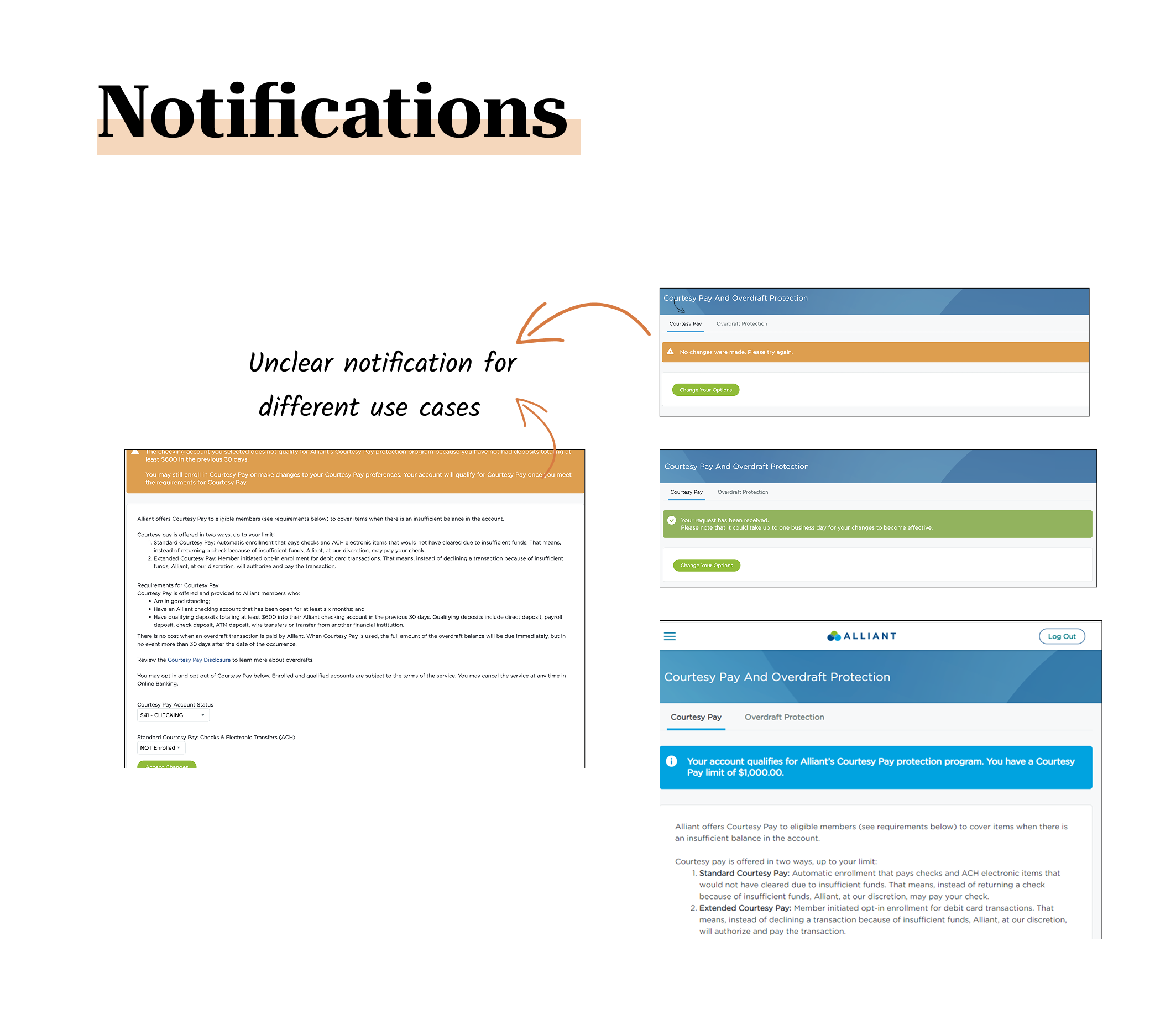 Members lacked confidence in managing Overdraft Protection and Courtesy Pay due to unclear qualification criteria, confusing error messages, and inconsistent system feedback. The absence of mobile access further compounded the issue, forcing members to switch platforms or abandon tasks during time-sensitive, high-stress financial situations.